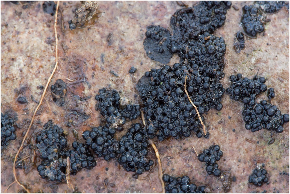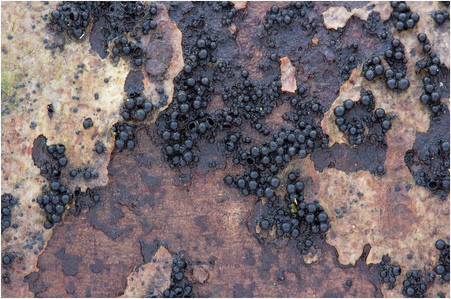 Ich war gestern wieder im Wald unterwegs und habe im Pappelwald an einem am bodenliegenden Pappelast kleine schwarze Kugeln gefunden.