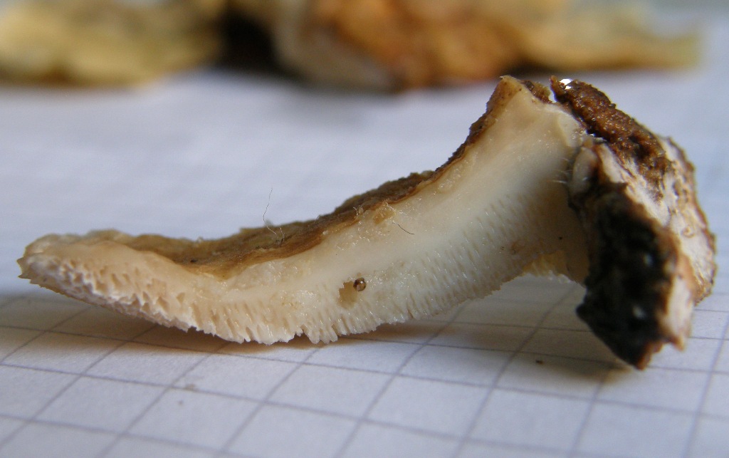 Links ist das Tomentum (Hutfilz), rechts das Hymenium.