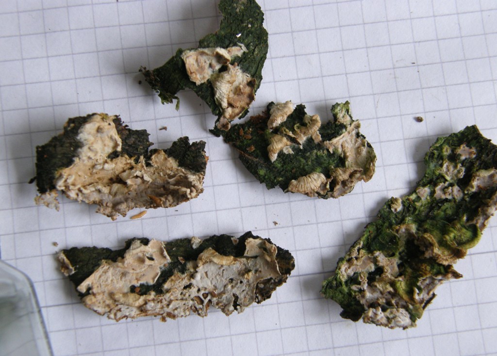 Das Material war ja auch ok, daß sich hin und wieder mal Pilz auf Pilz ansiedelt, kommt eben vor. Das hat hier aber wohl nichts mit der Wuchsform zu tun. Mir war schon bewusst, daß sich Ränder von Cylindrobasidium laeve vom Substrat abstehen, aber so ausgeprägt hatte ich das noch nie gesehen.