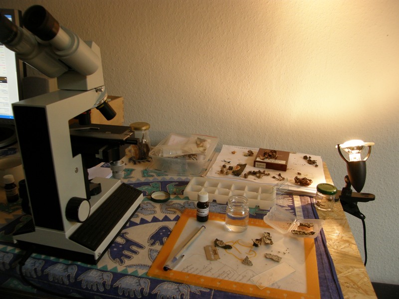 Die Pilze müssen nicht feucht sein. Du kannst - gerade bei Porlingen und Schichtpilzen - die Fruchtkörper auch zu hause komplett durchtrocknen. Die mikroskopischen merkmale lassen sich auch an so einem Exsikat gut darstellen. Wenn die Fruchtkörper feucht sind, "leben" sie ja weiter, entwickeln sich, nur eben meist nicht emhr so, wie es für die Art typisch ist. Wenn ein Pilz außerhalb des natürlichen Habitats weiterwächst, verändern sich oft Strukturen wie Form und Größe von Basidien und Zystiden.