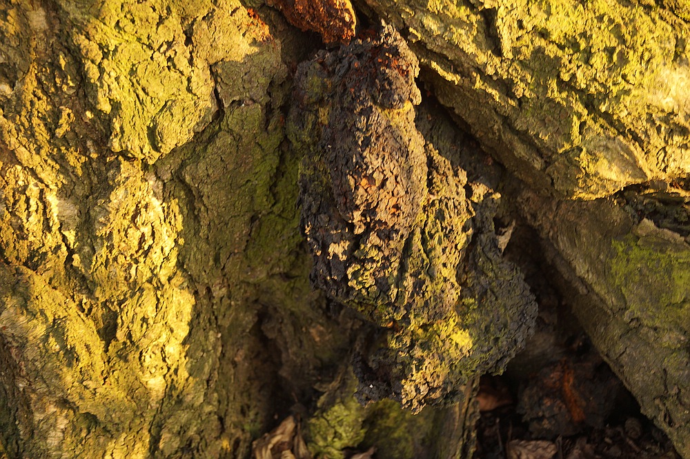 Etwas weiter unten am Stamm fand ich eine Stelle die rotbräunlich gefärbt war, sollte das etwa ganz Junger Chaga sein?