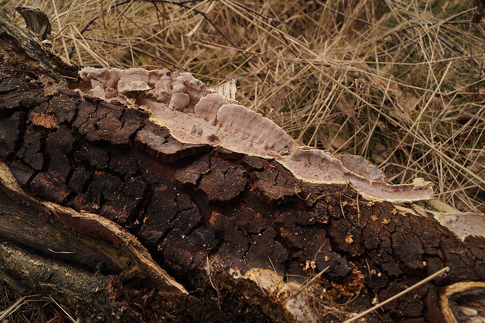 Zum Abschluss noch ein Schnittbild unter der Stereolupe. Oben sind die Poren, unten die Anwuchsstelle am Holz zu sehen.