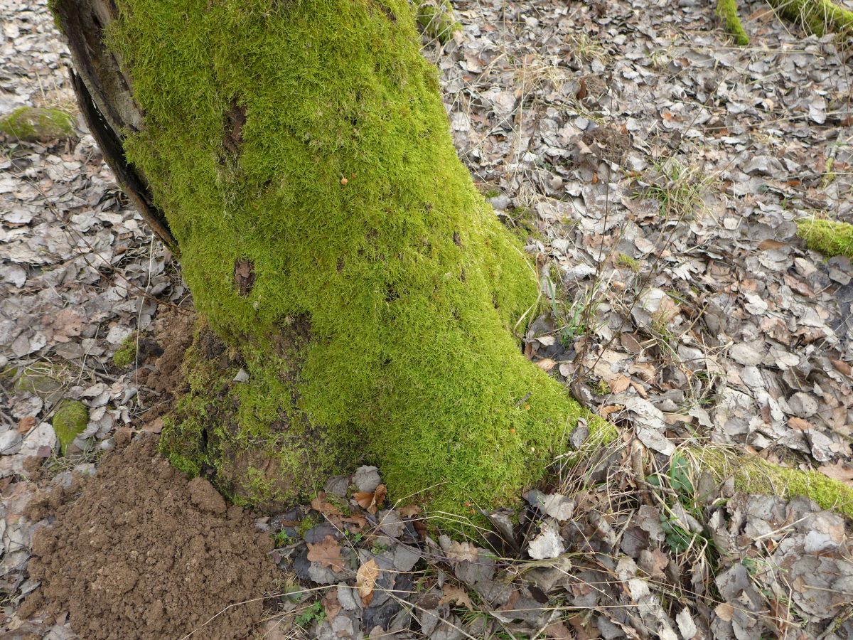 (2.6) Das Problem bei der Angabe, mit welcher Moosart ein Pilz vergesellschaftet ist, liegt außer in der Artenkenntnis darin, dass oft mehrere Moosarten gemeinsam vorkommen. Sie wachsen durcheinander und auch übereinander. Auch wenn das Bild unscharf ist: es zeigt, dass hier mehrere Moosarten vorkommen.