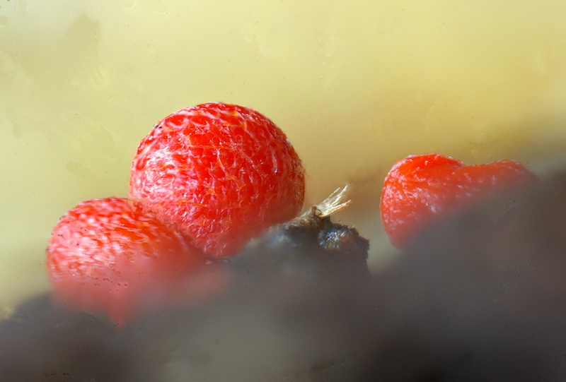 Rechts neben dem rechten Fruchtkörper steht die Cribraria cancellata, die ich in Teil 3.1 vorgestellt habe!