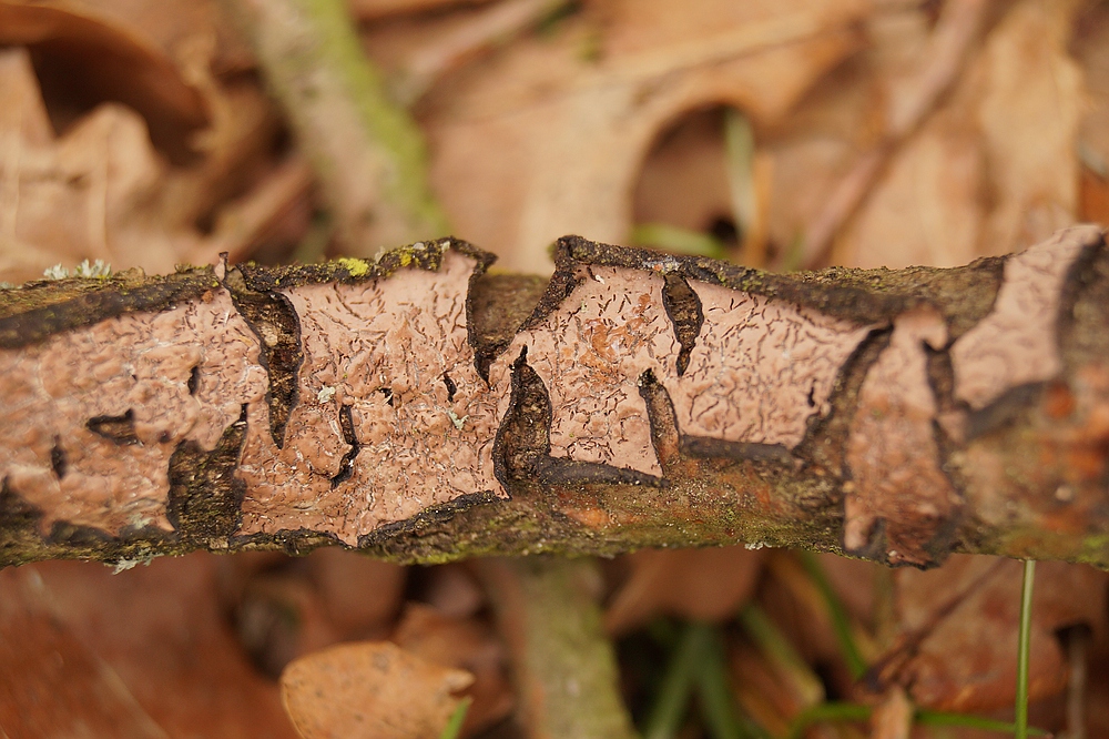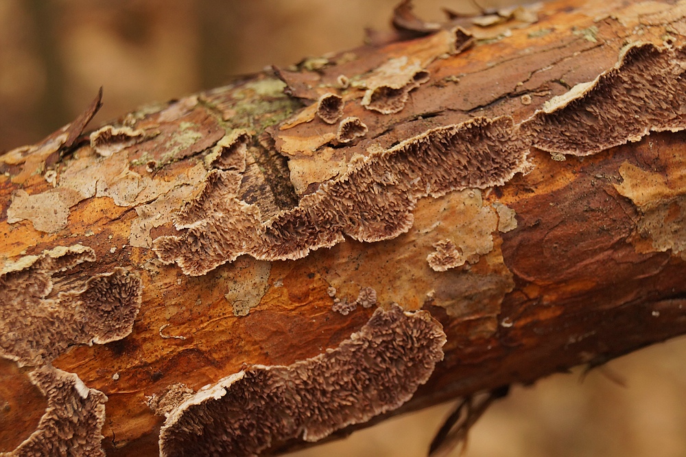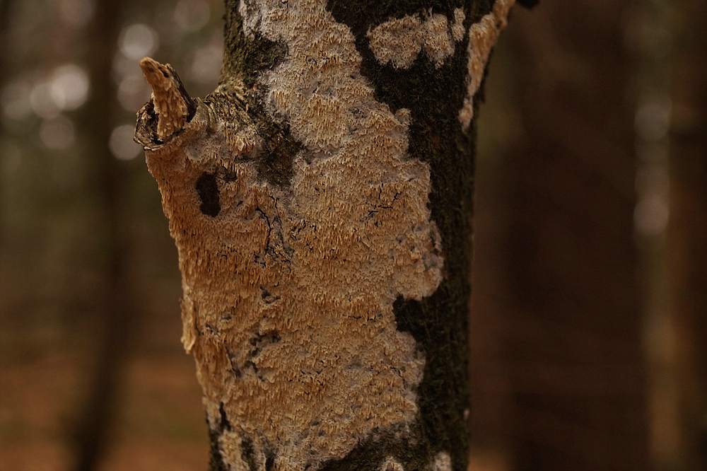 1. An Eiche findet man gewöhnlich den Eichen-Zystidenrindenpilz, Peniophora quercina