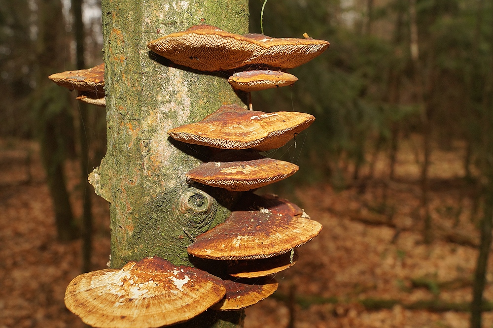 4. An einem dünnen Baum wuchs reihenweise die Rötende Tramete, Daedalopsis confragosa