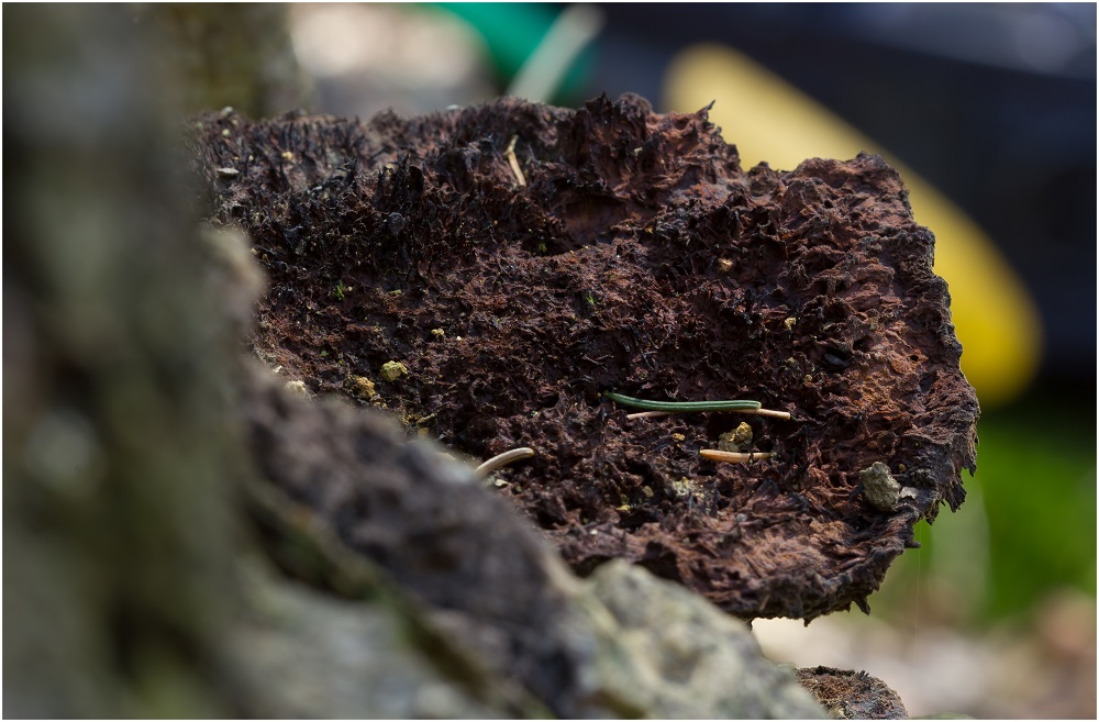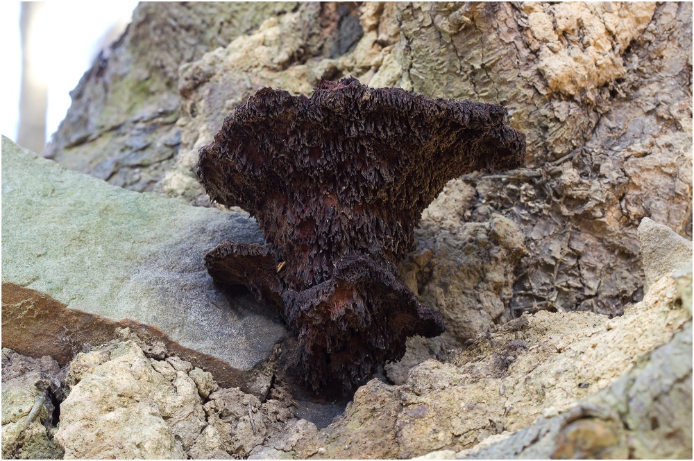 Da hätte ich schon arg danebengegriffen, Inonotus nodulosus sollte keine Stielansätze zeigen, keine labyrintischen Poren haben, keine neongelben Filzreste am Hut.