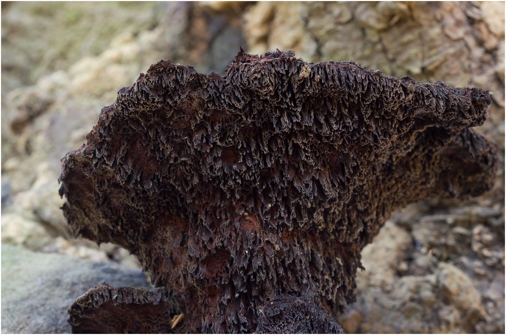 Die Poren von Phaeolus sind nur ganz am Anfang rundlich bis schwach eckig. Schon bald werden die etwas langgezogen, geschlitzt bisweilen oder auch labyrintisch.
