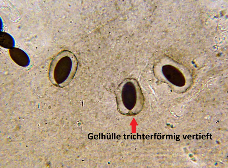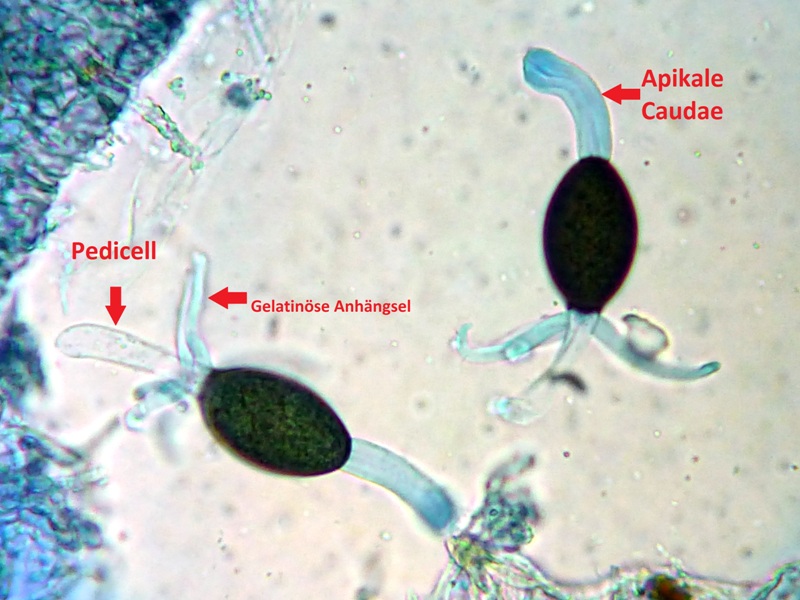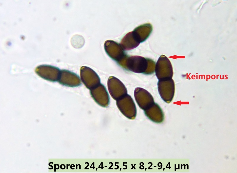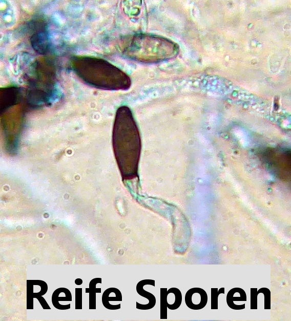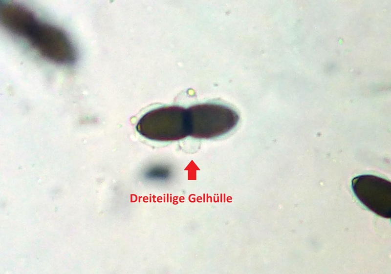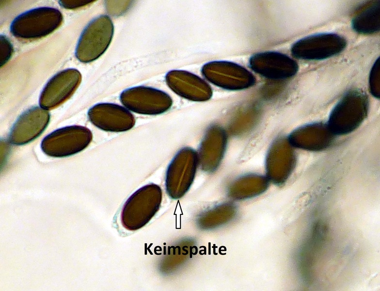Sporen braun einfach septiert, ohne Keimspalte, aber mit deutlichem Keimporus. Mit Gelhülle, darauf achten, ob diese zwei- oder dreiteilig ist.