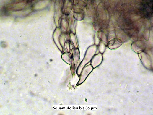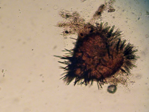 Perithecien wie podospora, aber mit sog. Squamufolien. Das sind Auswüchse meist am Perithecienkopf, die wie Scorpionstachel geformt sind. Sporen jung (hyalin) zweizellig ( wichtige Unterscheidung zu Podospora). D.h. der Sporenkopf und das Pedicell sind schon sehr früh durch eine Septierung getrennt. Sonst wie Podospora.