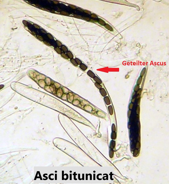 vielleicht habe ich mich blöd ausgedrückt. Die Asci der Sporormiella sind bitunicat. Die beiden Ascushälften sind ineinandergeschoben. Bei Reife wächst der Druck im Ascus und die obere Hülle schiebt sich nach oben weg. Der Ascus ist dann "geteilt".