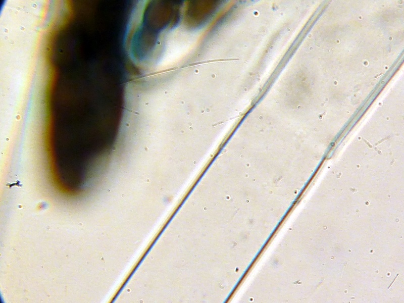 Zu erkennen ist eine gute Verdopplung der Länge sowie auch ein gewisser Raumgewinn. Die Sporen sind nach dem Ausfahren deutlich mehr voneinander entfernt als vorher. Sollte man Zweifel haben, welcher der Sporenschläuche zu messen ist, dann sollte man sich die Probe unter dem Mikro eine Weile angucken, meistens platzen irgendwo Sporenschläuche auf. Es ist natürlich klar, dass man die noch nicht ausgefahrenen Asci misst. Noch ein anderes Beispiel: