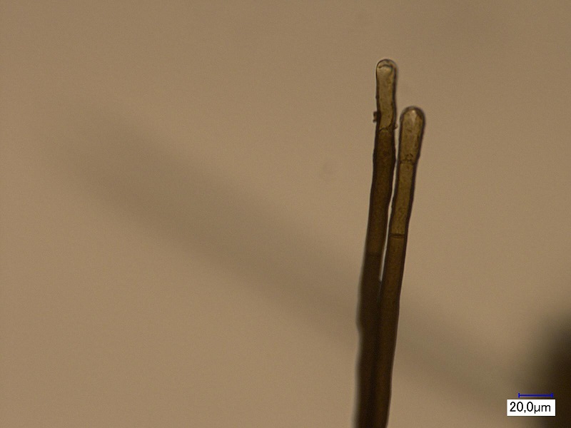 bei dem, was aus der Nadel wächst würde ich vermuten, dass das so Härchen sind, wie sie Gymnopus androsaceus produziert. Sowas hab ich mir allerdings nie genauer angesehen, ob die septiert sind weiß ich nicht.