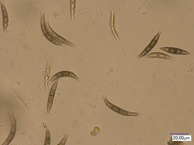 Asci konnte ich keine finden, dafür aber gebogene 3-fach septierte Sporen mit großen Öltröpfchen. Auffällig sind die Sporenenden und die relative Instabilität (konnte viele zerbrochene Sporen im Präparat finden). Die Maße betrugen 39-48 x 5,5-7,5 µM