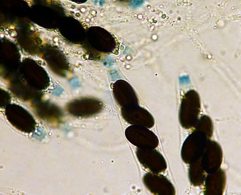 Ausgebuddelt erscheint ein recht stattliches, rundliches Perithecium. Die Apikalapparate färben sich mit Melzer schön blau. Die in der Literatur erwähnten kleinen Anhängsel an den Sporen konnte ich nicht feststellen.
