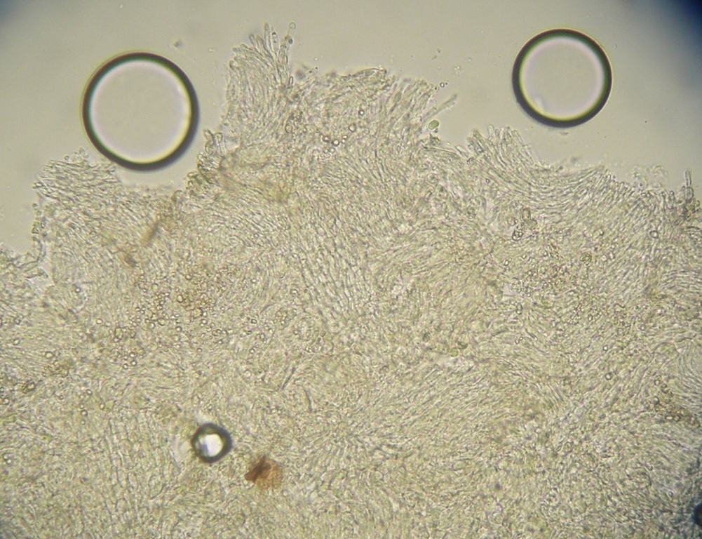 Mit nur kurzen Haaren, ungestielt, der blassen Farbe und der blauen Lugol-Porus-Reaktion kommt mein Tipp zu leicht ins Wanken und ist gerade umgefallen.