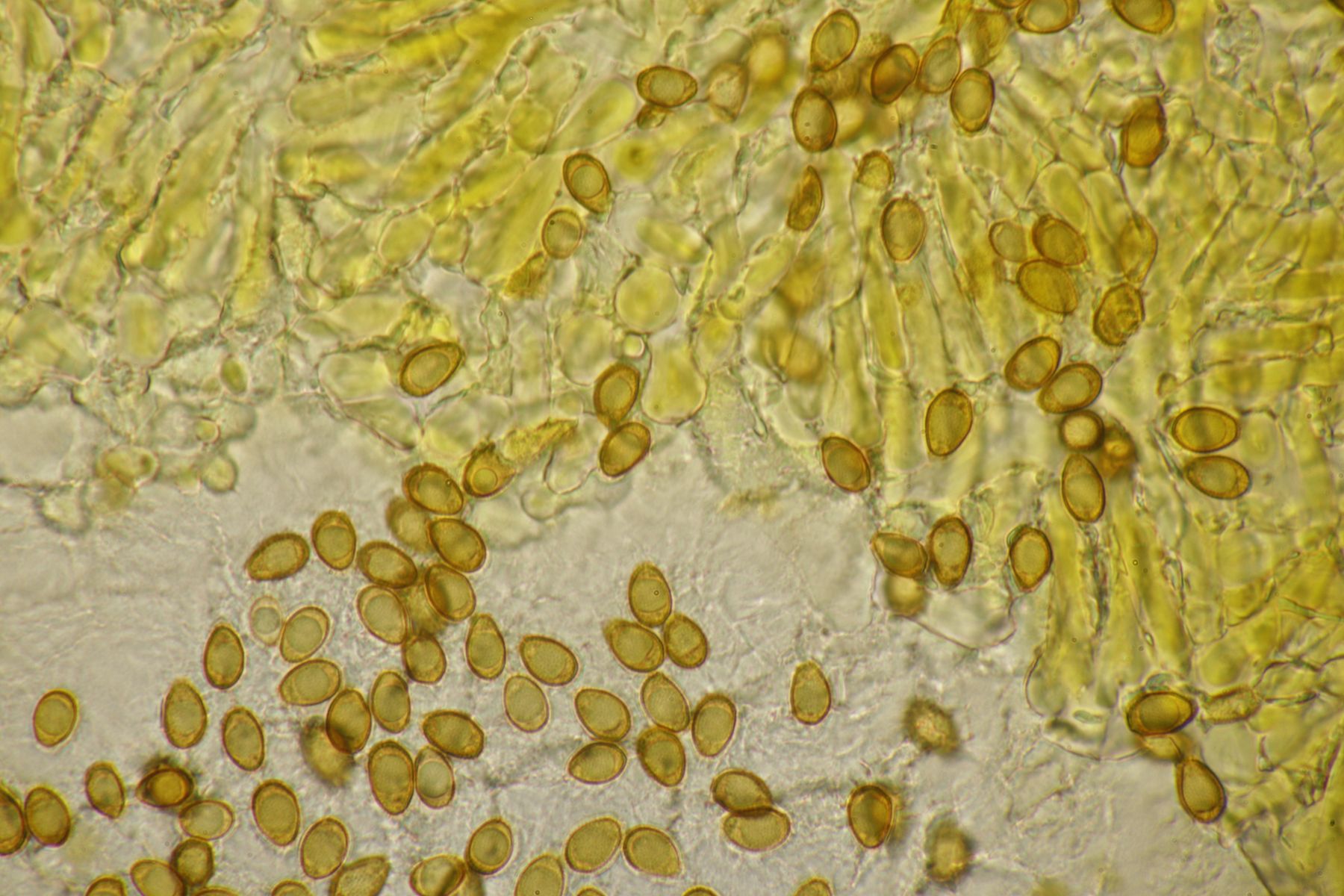 Sporenpulver: braun; Sporen doppelwandig: Außenwand glatt, dünn, hyalin; Innenwand braun, warzig-stachelig; mit dem Exospor durch feine (unsichtbare) Palisaden verbunden