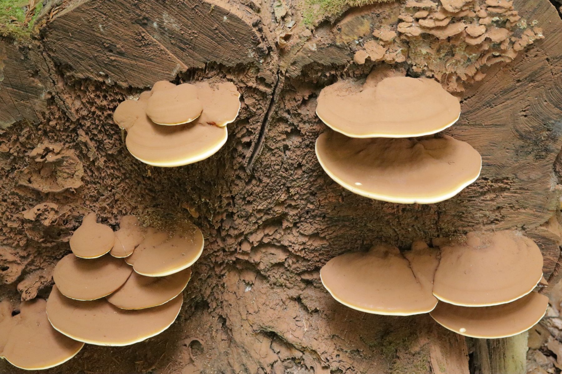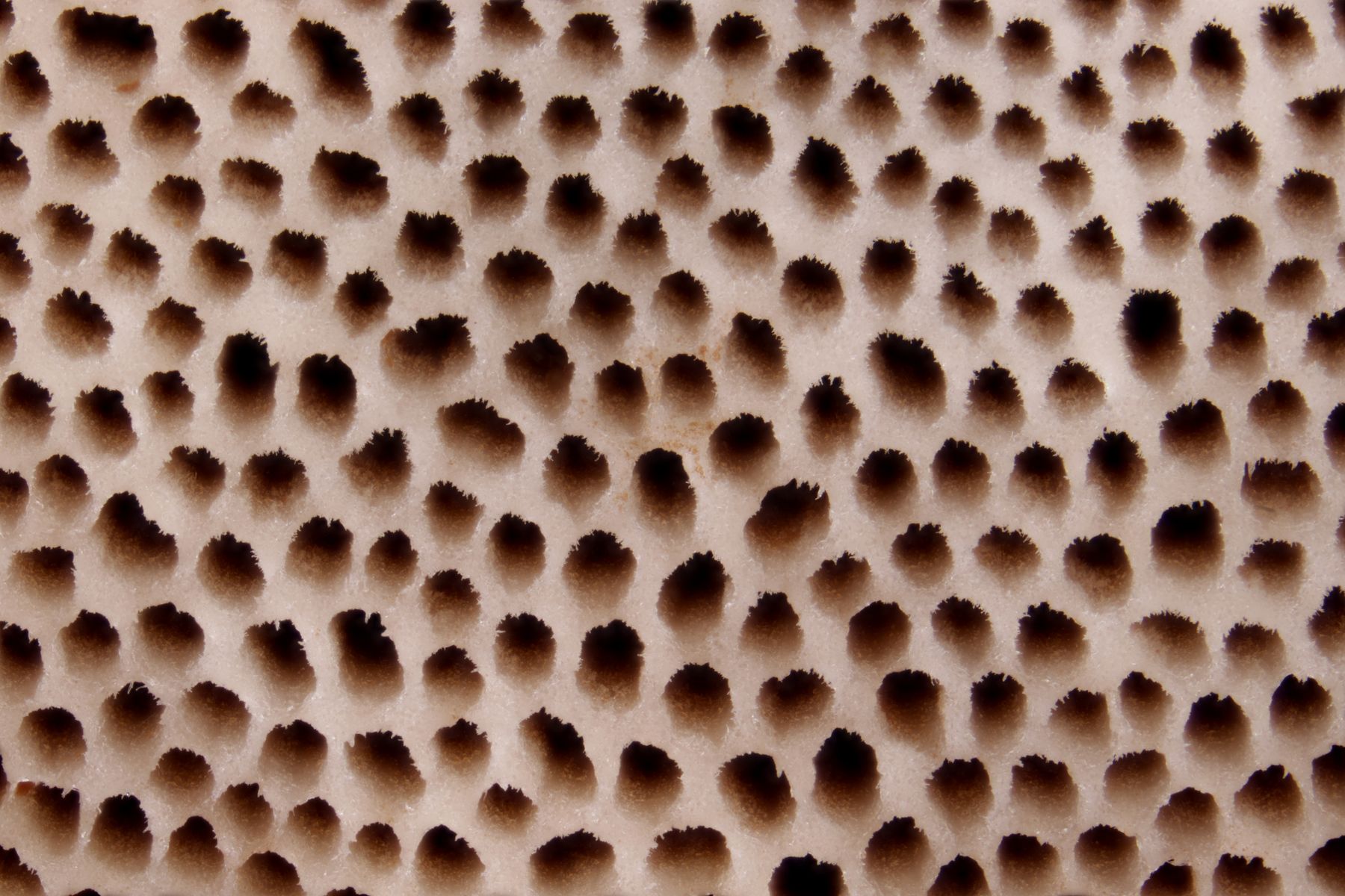 Poren frisch weißlich überzogen, sehr fein; alt ockerbraun