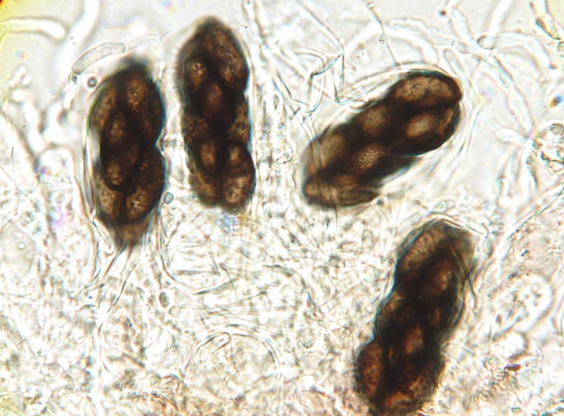 Wie gesagt, die Apothecien sind deutlich bräunlich- rosa-violett gefärbt. Das intrazelluläre Pigment ist auf dem Mikrofoto deutlich sichtbar. Unreife Sporen sind ebenfalls rosa-violett gefärbt. Reife Sporen sind extrem dunkel und das Epispor so dick, dass ich volle Beleuchtung geben musste, um ein Muster zu erkennen. Die Cluster messen 38,0-39,5 x 14,2-15,8 µm, die Sporen (sehr schwer zu vermessen da es keine losen Sporen gibt und eben nix durchscheint) um 16x8 µm.