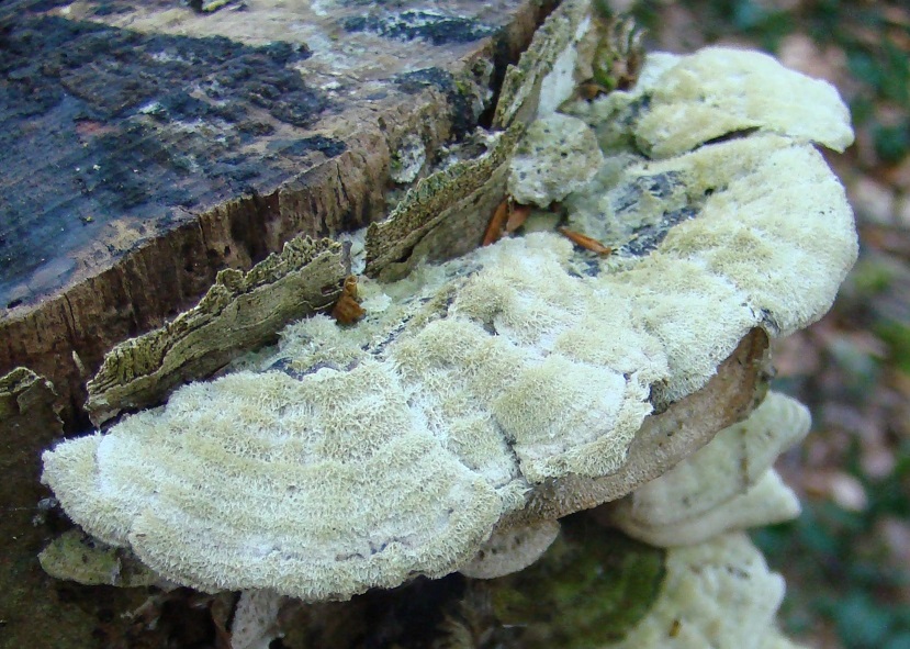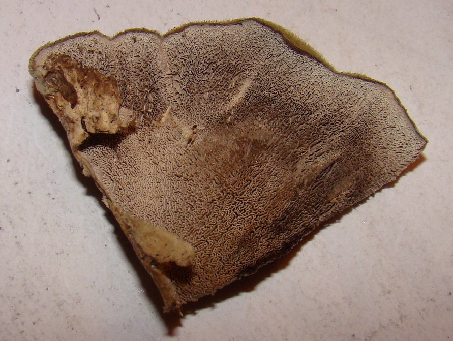 Dann könnte man noch an Coriolopsis gallica (Dunkle Borstentramete, reagiert dunkel mit KOH) denken, aber die hat ganz andere Fleischfarben und auch die Huthaare sind normalerweise nicht weiß.