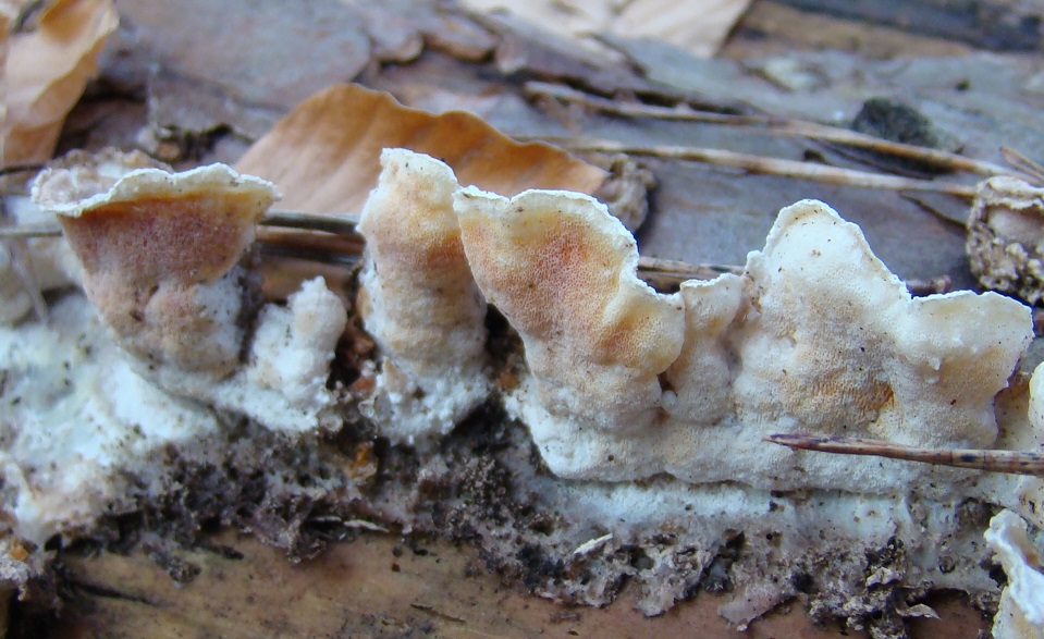 Erinnert in Wuchsform und dem dünnen FK (1 - 3 mm) sofort an Tramete. Allerdings ist eine igendwie geartete Behaarung, die bei allen Trameten als striegelig oder samtig beschrieben wird, inbesondere bei den jungen Ex. bei näherem Hinsehen kaum zu erkennen, nur eine irgendwie unebene wulstige raue Struktur, auf den Detailfotos von zu Hause gut zu sehen. Schade dass ich durch mein Stereo-Mikro keine Fotos hinbekommen. Der Geruch ist angefeuchtet angenehm pilzig aber nicht irgendwie besonders.