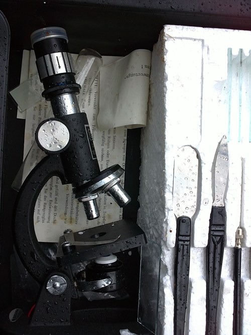 Es als Lupe zu nehmen ging nich tun ddurch zwei de rOkulare sah ich nichts, aber das dritte funzte, da konnte man die struktiur ganz gut sehen. Fotografieren mit dem handy war aber mehr als schweirig, und ich habs auch nur einmal hingekriegt ein unscharfes bild zu machen:aber ich fürchte das mikroskopieren" kleiner Tierchen aus dem Wasser" könnte schwierig werden denn: