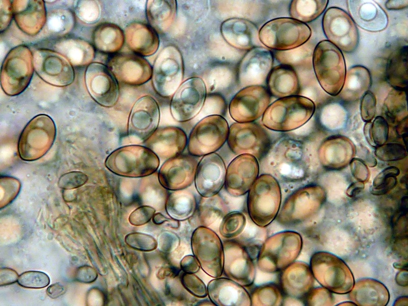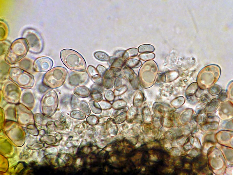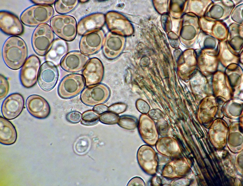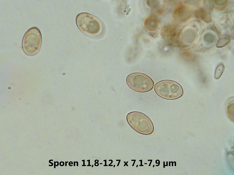 Die Sporen sind jung hyalin, bei Reife honigbraun. Sie enthalten entweder einen großen, zwei kleine, oder einen größeren und mehrere sehr kleine Öltropfen.