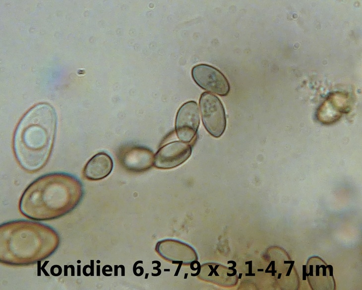 Erst unter dem Mikro sah ich ein langes Ostiolum, ähnlich wie bei Sphaeronaemella. Obwohl das Kügelchen sehr frei und alleine stand, kann ich einen Fremdeintrag nicht ausschließen. Vor allem randlich um den Fruchtkörper fanden sich zahlreiche Konidiensporen?, die wahrscheinlich zur gesuchten Art gehören.