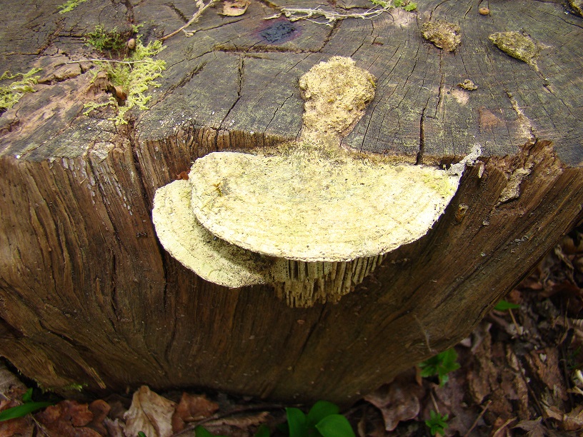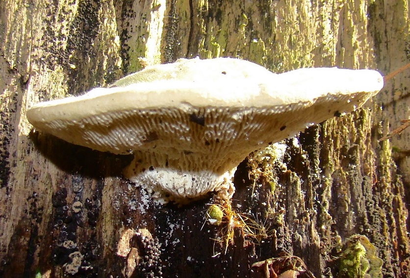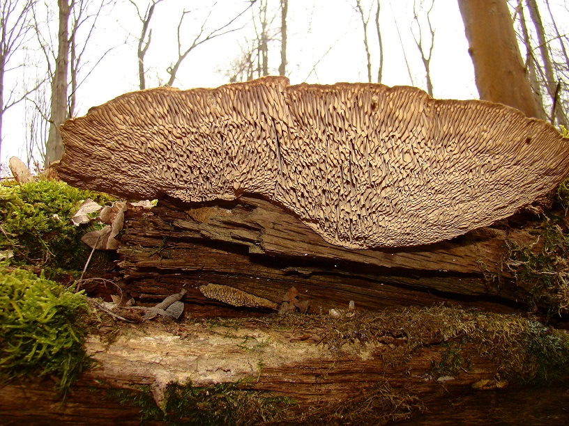 Ich habe hier auch noch ein Foto von Trametes gibbosa, vom vorigen Oktober, zwar etwas hell, aber auch mit ziemlich langezogenen Poren über die gesamte Fläche, das passt also wirklich gut.