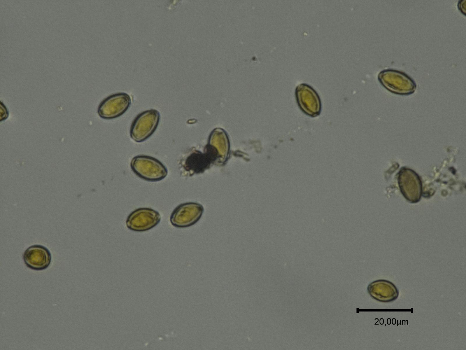 Dann wollte ich mir die Sporen anschauen, allerdings gab es eine Überraschung. Ich fand typische Sporen, die allerdings irgendwie alle geschädigt aussahen. Zwei nicht ganz geschädigte konnte ich messen, mit 32-36 x 4,7-5,2 µM passten die ganz gut zu meiner makroskopischen Einschätzung. Allerdings fanden sich überwiegend andere Sporen, die weder zu Lasiosphaeria, noch zu Bertia passen. Die Sporen waren kugelig bis elliptisch, mit auffälligen Enden und teils seitlichen "Dellen". Die Maße betrugen 12,3-14,3 x 8-8,6 µM.