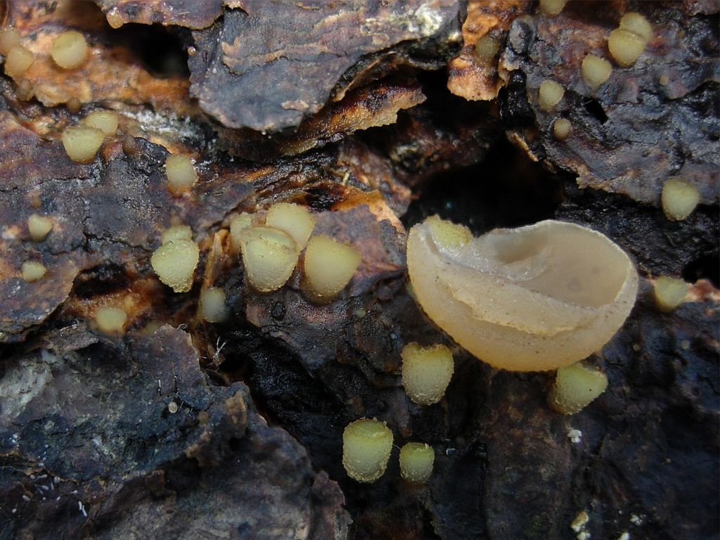 Lasiobelonium variegatum (Marmoriertes Weißspitzhaarbecherchen) an Holz.
