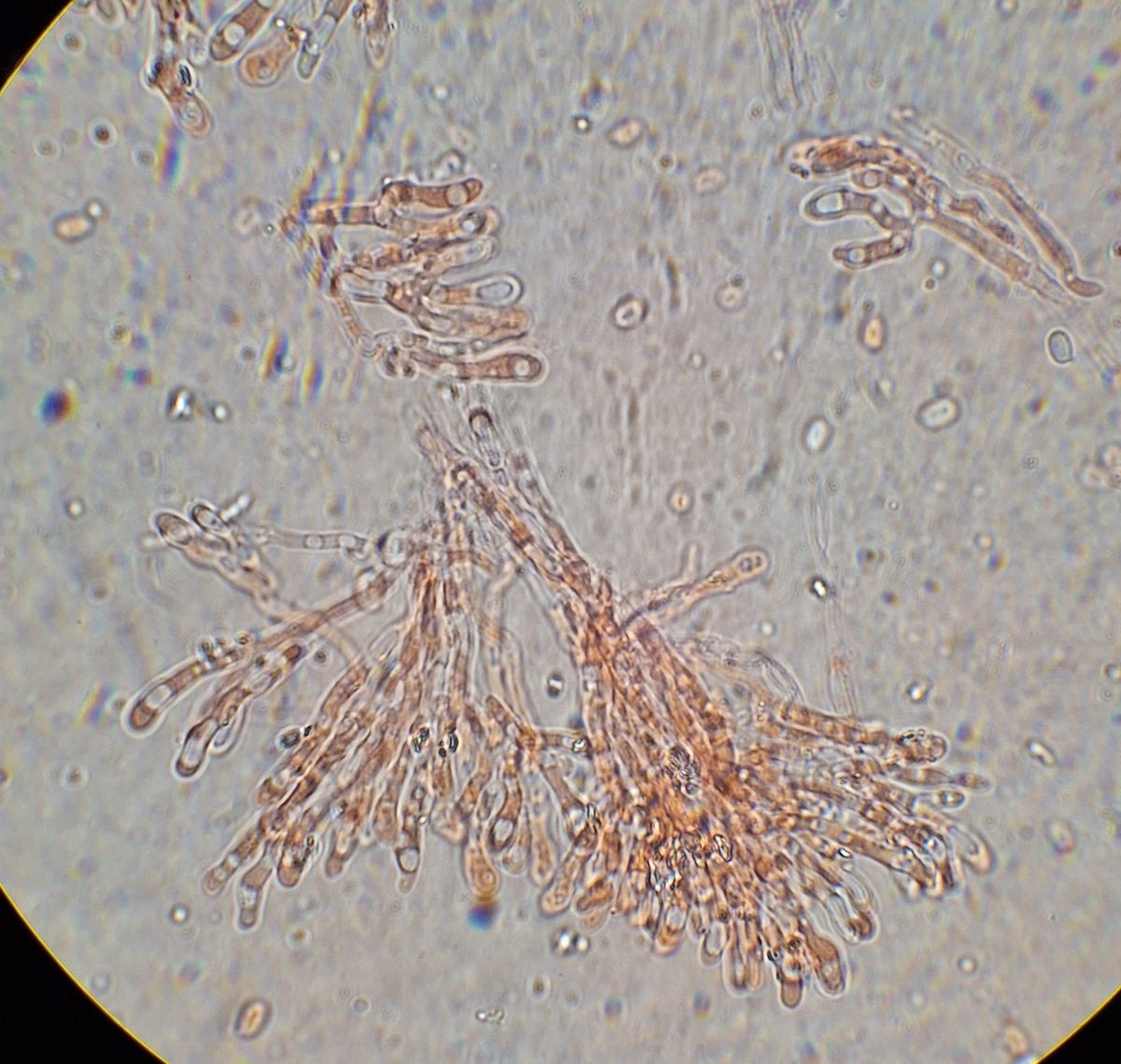 Basidien zwei- bis viersporig, keulig, hyalin, eher kurz, in dicher Palisade, keinerlei Zystiden oder Hyphidien beobachtet