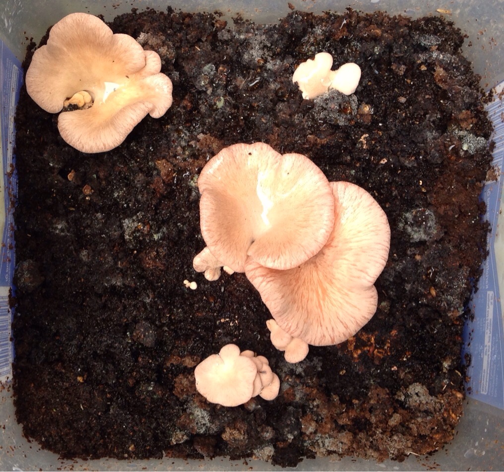 Da wächst ja schon etwas! Ein paar voreilige Seitlinge waren durch den Kartonboden entkommen ihre Hüte lugten aus der Tupperdose