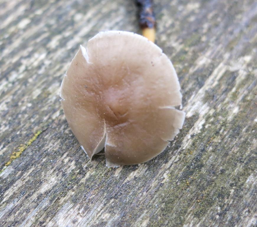 Hut: So bis 2 cm, anfangs gewölbt dann ausgebreitet mit Buckel. Anfangs dunkelbraun bis später am Rand graubraun zum Zentrum braun. Eher nicht gerieft.