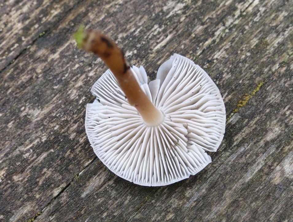 Lamellen: weißlich, normal weit, bauchig, angewachsen, versch. lange Zwischenlamellen.
