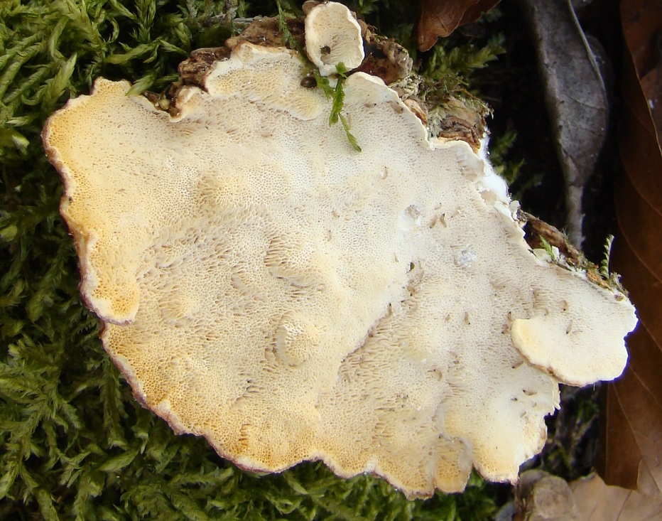 Schon vor Ort sahen mir die Trameten nicht wie versicolor aus, nicht bunt genug, Zonierung eher bräunlich. Zu Hause beim Trocknen dunkelten zwar einige der gesammelten Proben nach, insbesondere ältere Ex., ich meine jedoch trotzdem, dass alles die gleiche Art bleibt. Das Ganze sah mir dann doch eher wie Trametes ochracea aus, möchte aber doch gern die 6 gesammelten Proben zur Diskussionstellen. Außer der Färbung spricht auch die relativ dicke Anwuchskante dafür, die auf einigen der nachstehenden Fotos gut zu sehen ist. Die berühmt-berüchtigten schwarzen Linien zwischen Kontext und Tomentum kann ich allerdings nirgends sehen, die im Schlüssel der GPBW allerdings beide Arten aufwiesen sollten.