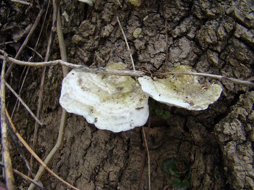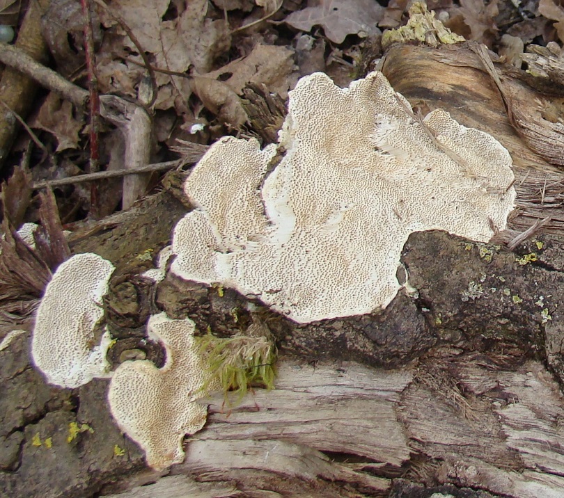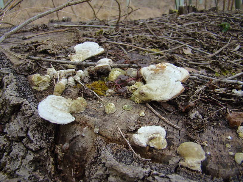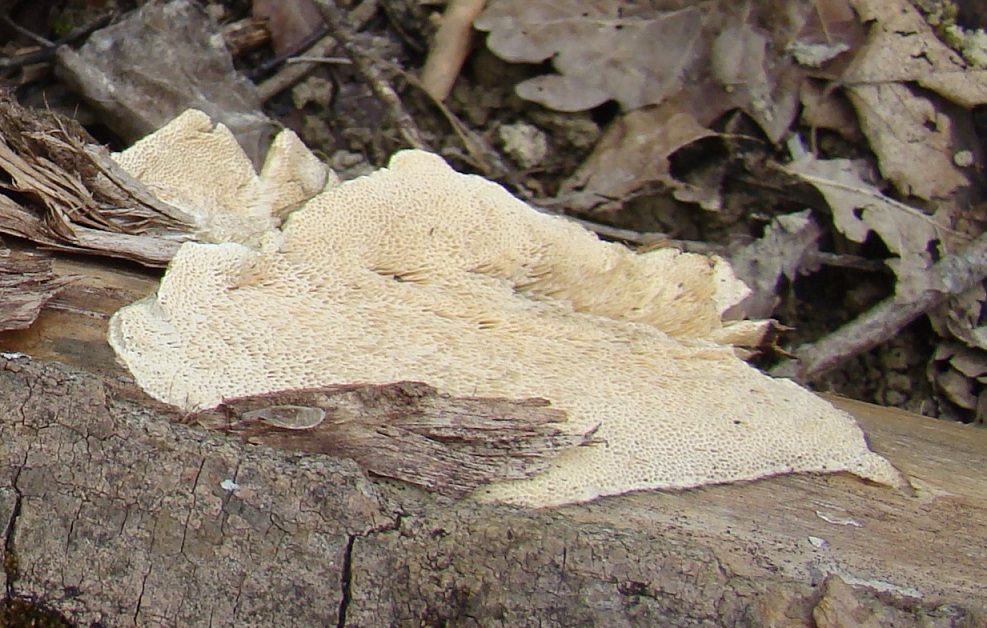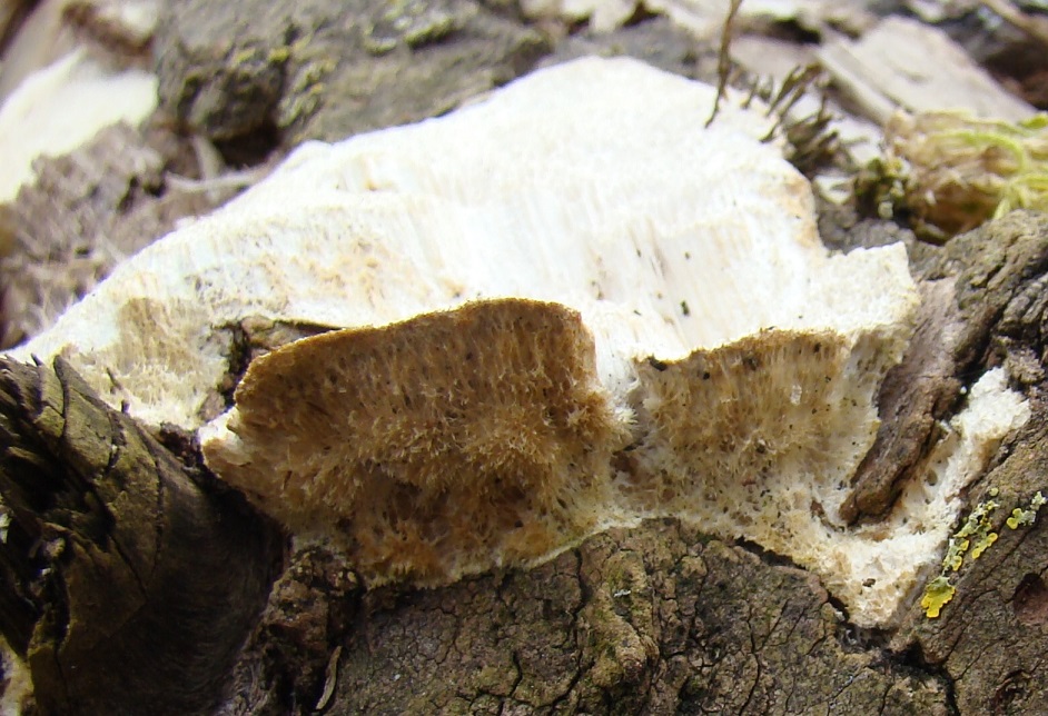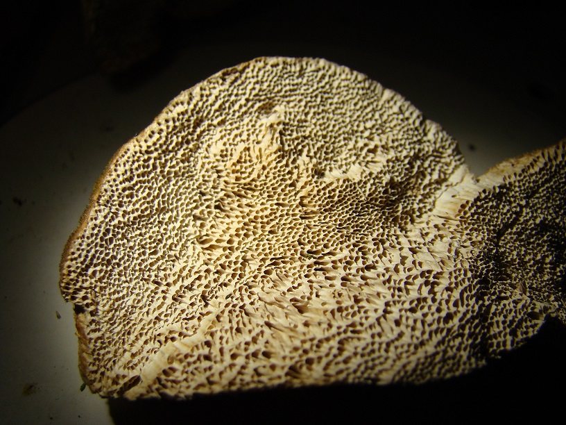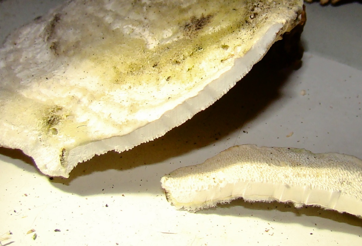Hier noch dagegengestellt ein anderer Fund unweit davon vom gleichen Tag, jdeoch an einem Pappel-Stubben. Diesen halte ich insbesondere wegen der eher runden und auch sehr kurzen Poren mit auch deutlich dickeren Wänden dazwischen sowie dem weißen glatten Fleisch eher für Trametes hirsuta: