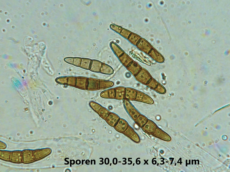 Die Sporen sind, wenn reif, 5-fach septiert mit deutlich verdickter 3. Zelle.
