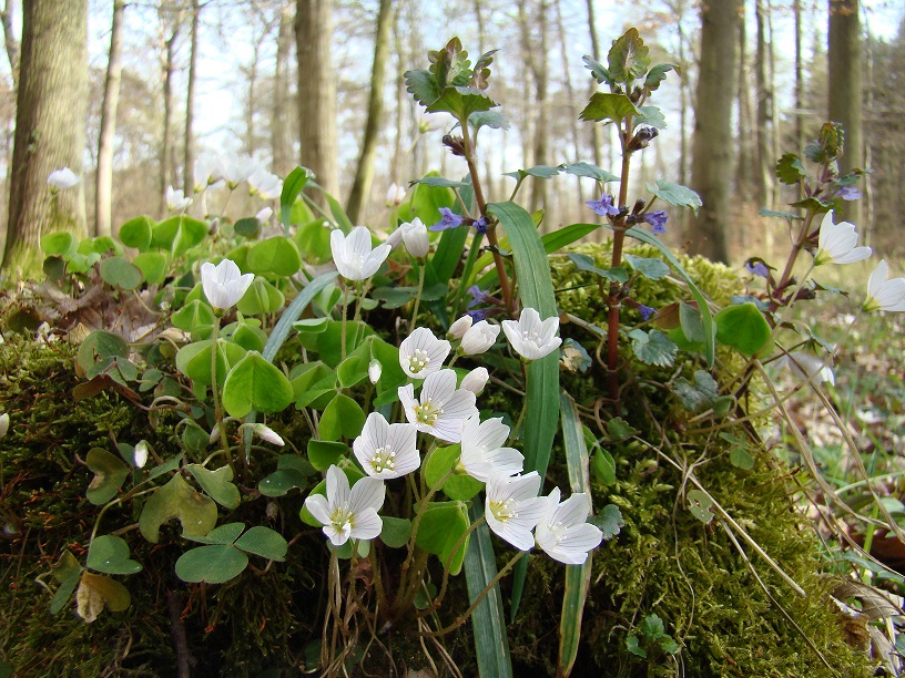 Oxalis actosella - Sauerklee, mit Glechoma (Gundermann) - ganz bezaubernd an einem mosigen Baumstumpf: