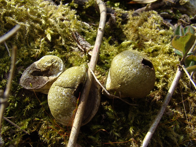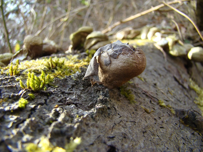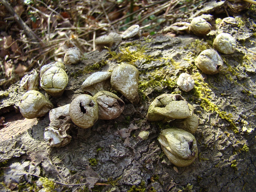 Und noch älter und ganz staubig - Birnenstäubling (Lycoperdon pyriforme) auf liegenden Fagus-Stämmen: