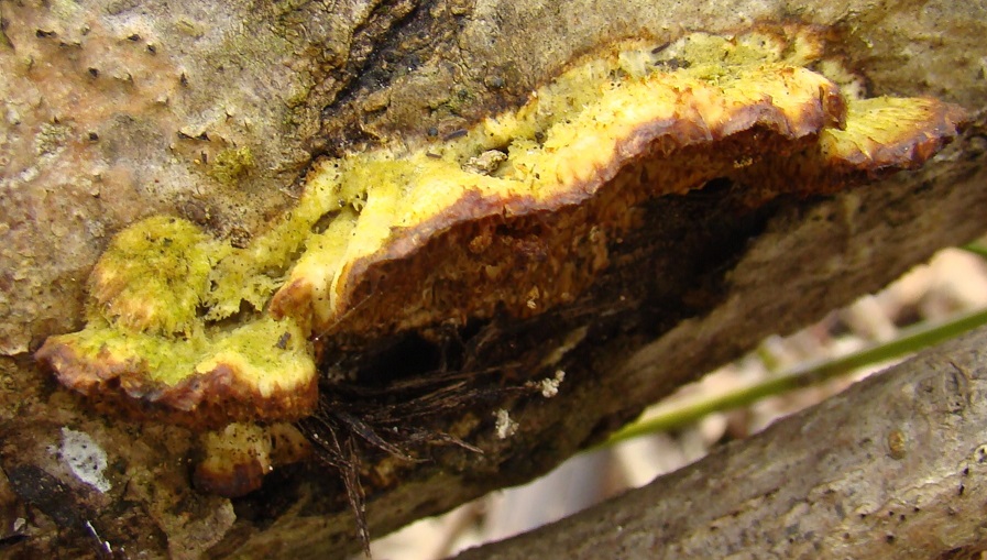 diesen irgndwie bunt wirkenden kleinen Baumpilz (ca. 3 cm) hatte ich am 15.03. in der Hördter Rheinaue (Pfalz) an liegenden Ästen von Populus alba gefunden. Die Poren sind relativ grob (0,6 - 1 mm, wirken irgendwie zwar unordentlich, aber trotzdem wabenartig), die OS wirkt striegelig, aber nicht behaart.
