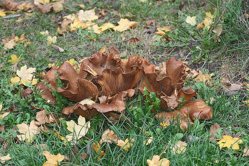 Es wäre schön, wenn du die Pilze in verschiedenen Altersklassen zeigen könntest. So ist es sehr schwierig. Dennoch wage ich eine vorsichtige Bestimmung, die ihr auch gleich wieder verwerfen könnt. Ich habe in der letzten Woche einen Platz aufgesucht, auf dem im Vorjahr Riesen-Träuschlinge wuchsen. Auch in diesem Jahr waren sie wieder anzutreffen, jedoch in einem sehr späten Stadium. Auch bei diesen Pilzen war der Hutrand so gewellt. Und ich konnte kaum glauben, dass das die gleichen Pilze sind. Sie wachsen gern auf Holzhäcksel. Oft ist das Häckselgut schon lange überwuchert, die Pilze sind dennoch vorhanden.