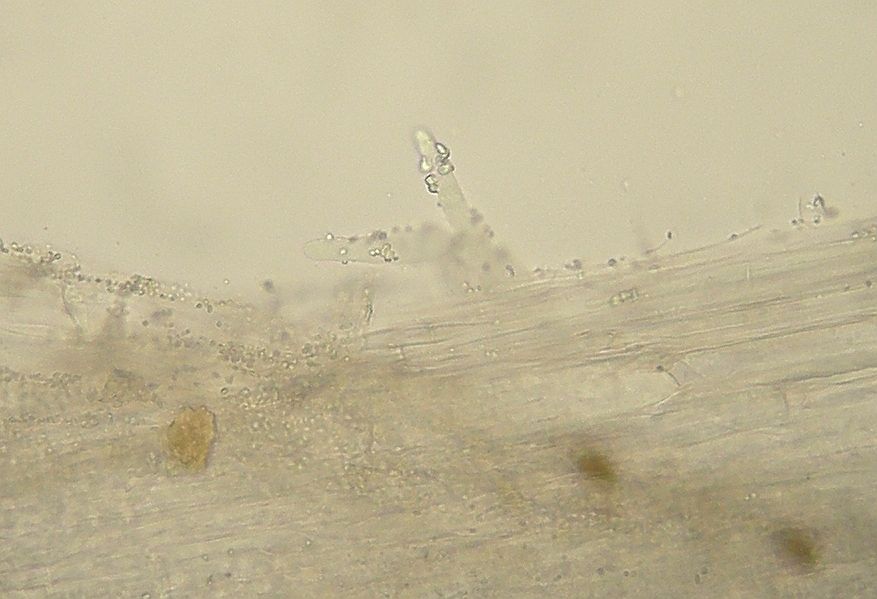 Schnallen sind nach wie vor keine zu sehen, weder an den Hyphen der Lamellentrama, noch an den Stielhyphen, noch an den Basidien.