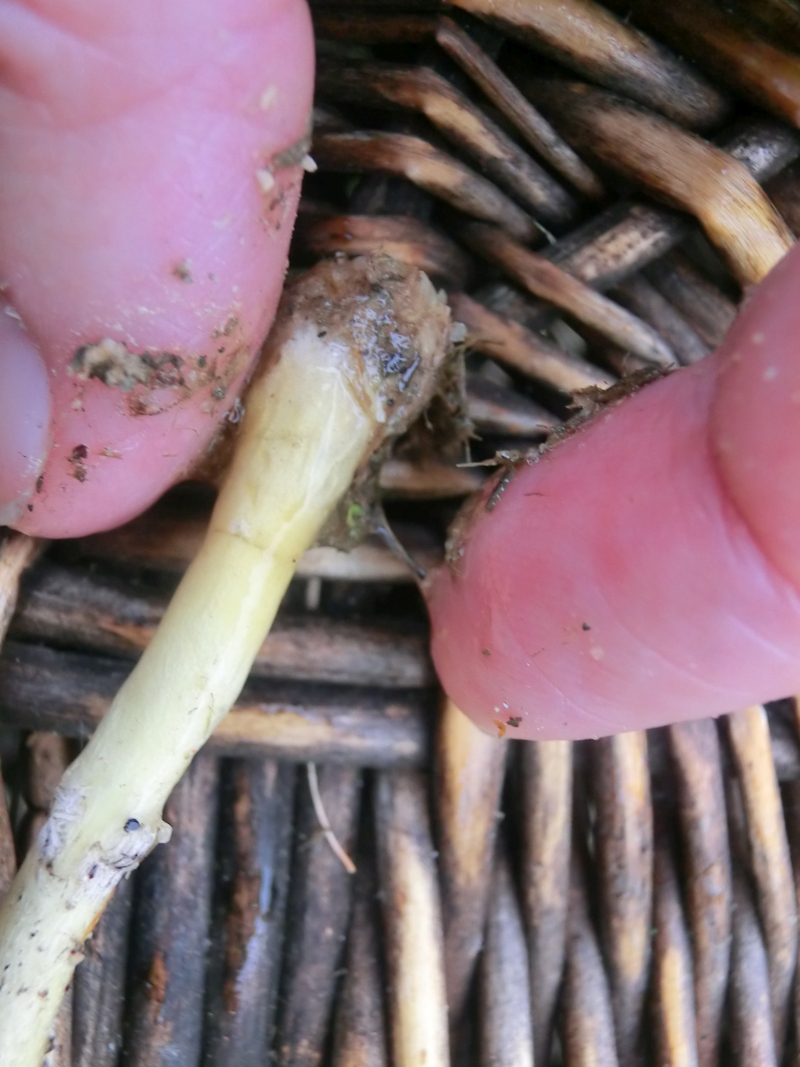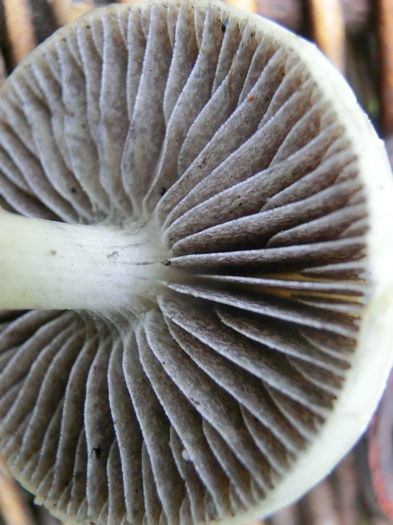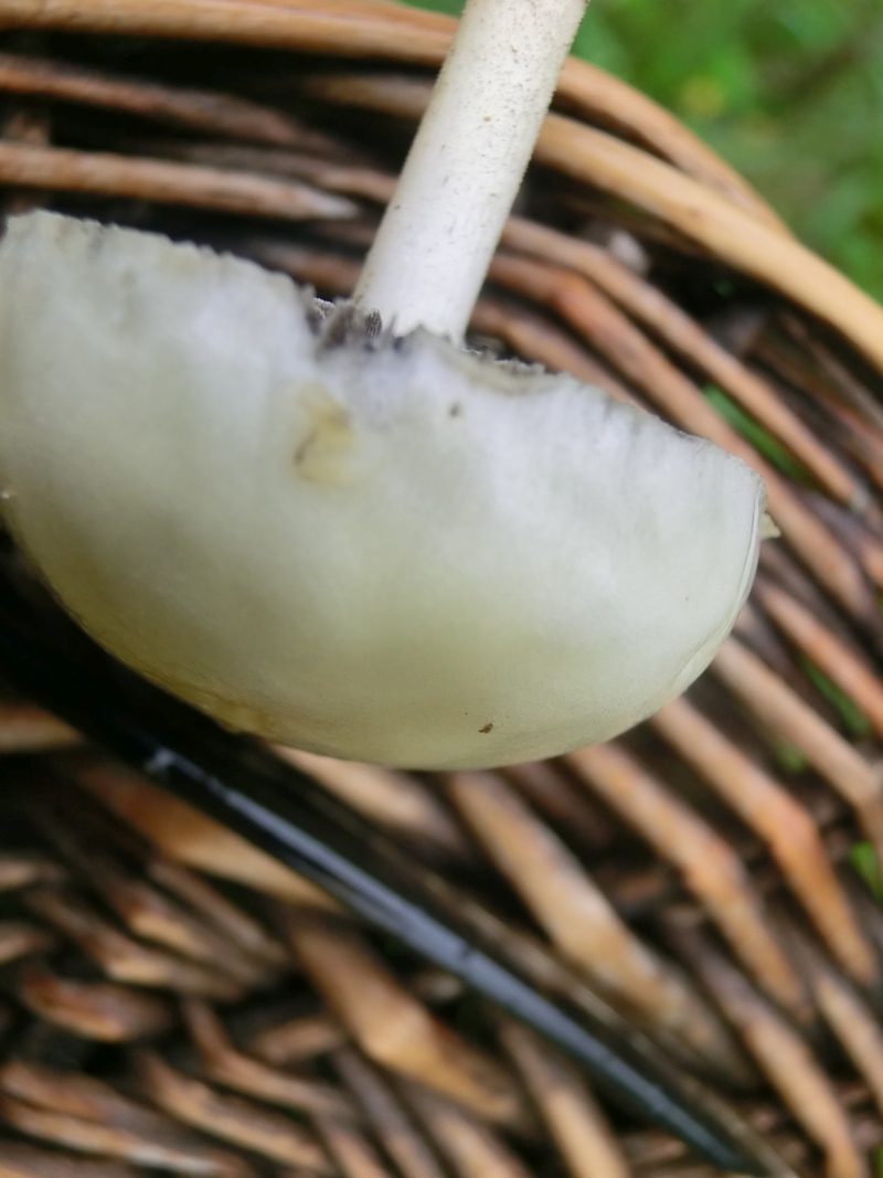 Der Pilz ist weiß/cremefarben. Der größte war ca. 8 cm hoch. Hutdurchmesser ca. 3-4 cm. Geruch: so nach nichts. Auf dem Stiel befanden sich Schüppchen. Stielende etwas Keulenförmig, ziemlich schleimig (auch der Hut). Die grau/schwarzen Lamellen stehen etwas entfernt und sind kräftig.