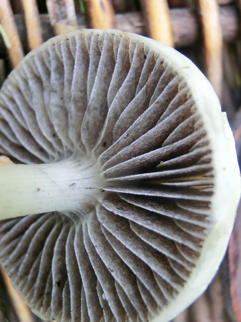 Der Pilz ist weiß/cremefarben. Der größte war ca. 8 cm hoch. Hutdurchmesser ca. 3-4 cm. Geruch: so nach nichts. Auf dem Stiel befanden sich Schüppchen. Stielende etwas Keulenförmig, ziemlich schleimig (auch der Hut). Die grau/schwarzen Lamellen stehen etwas entfernt und sind kräftig.