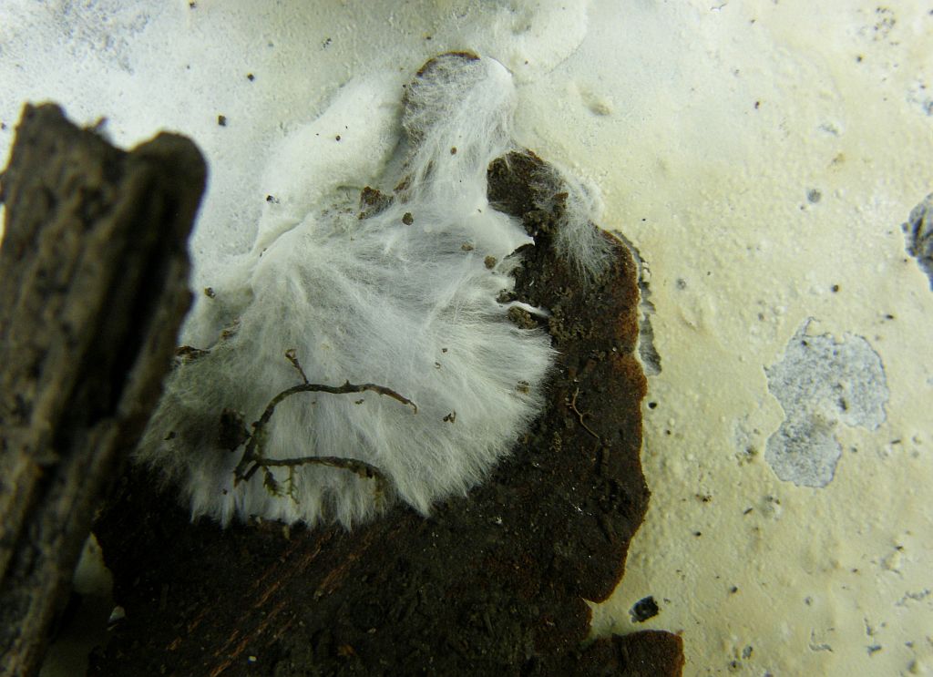 Den hatte ich als Athelia bombacina bestimmt, aber nun macht sich Skepsis breit. Saß an Birke, aber sowas wie Rhizomorphen sind da ja auch dran. Oder besser gesagt: Ganz feine Fäden, die sich von den Rändern aufs substrat ziehen. Basidien und Sporen waren da etwas größer als bei dem Fund oben, aber die Hyphen will ich nochmal genau sehen.