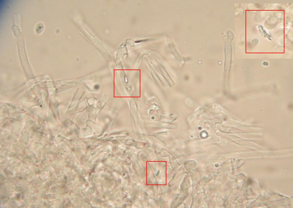 Sehr interessant, auch daß hier die Hyphen einen Tick breiter sind als im hymenium und im Subikulum direkt darunter. Und auch solche Anastomosen habe ich da nicht gesehen. Aber unter "ampullenförmig angeschwollen" kann ich mir nun etwas vorstellen, glaube ich.