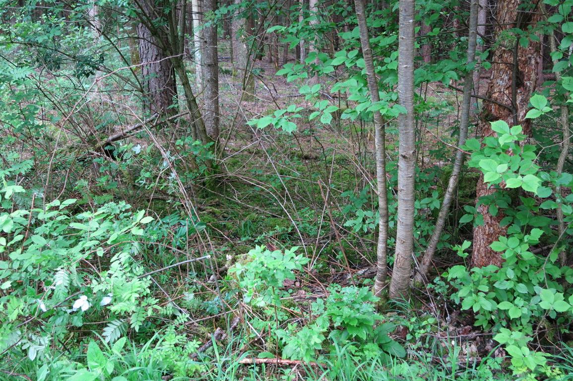 VK: Moosüberzogener Stumpf neben Forststraße, vermutlich Laubholz, nicht erkennbar. Umgebung s. Foto.