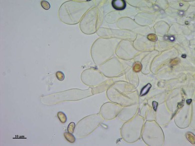 Mikro : Sporen 9,1-11,4 X 5-6,9 , glatt , kartoffelförmig (für Bohnenförmig zu unregelmäßig). Schnallen vorhanden. Cheilozystiden keulig , ohne Kristalle. Basidien 4-sporig. An der Stielspitze jede Menge keulenförmige dünnwandige Zystiden , nach unten zu weniger werdend.