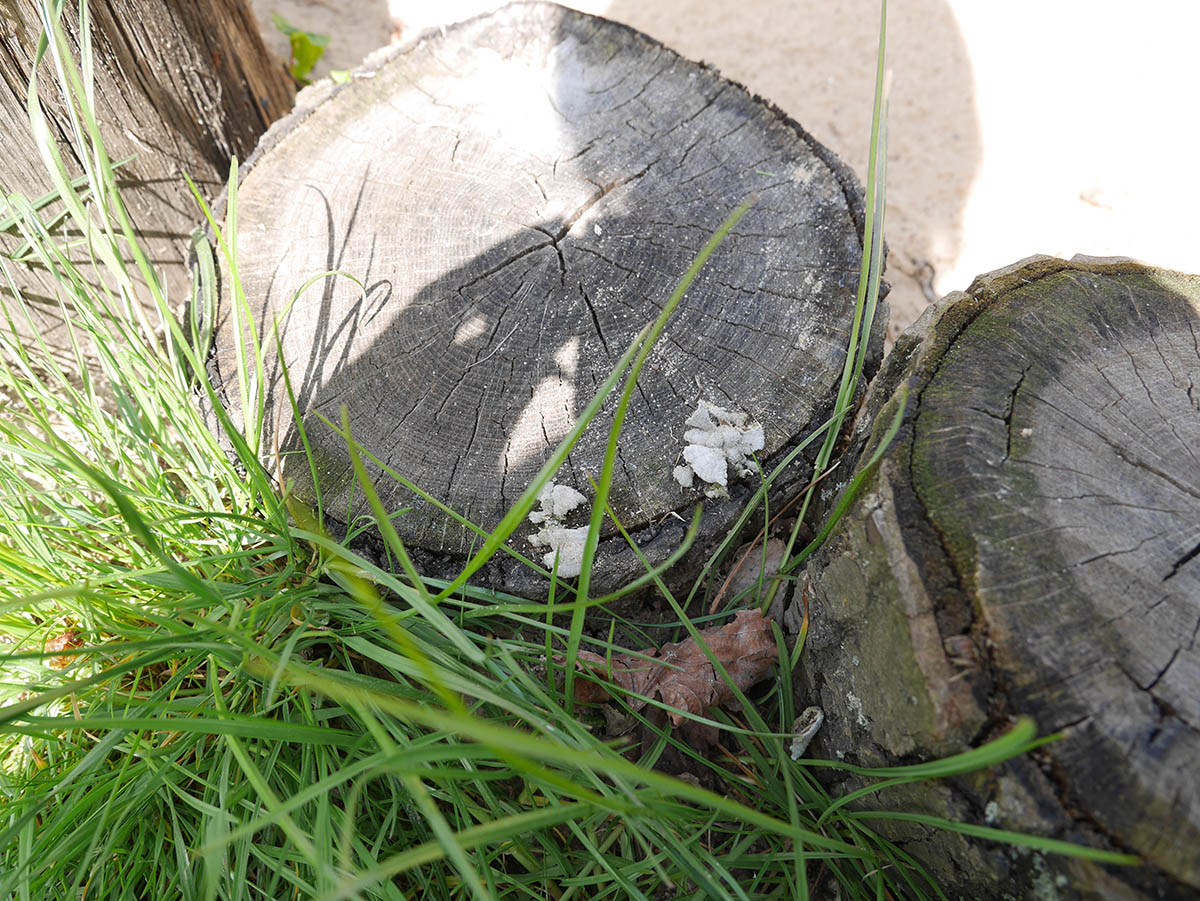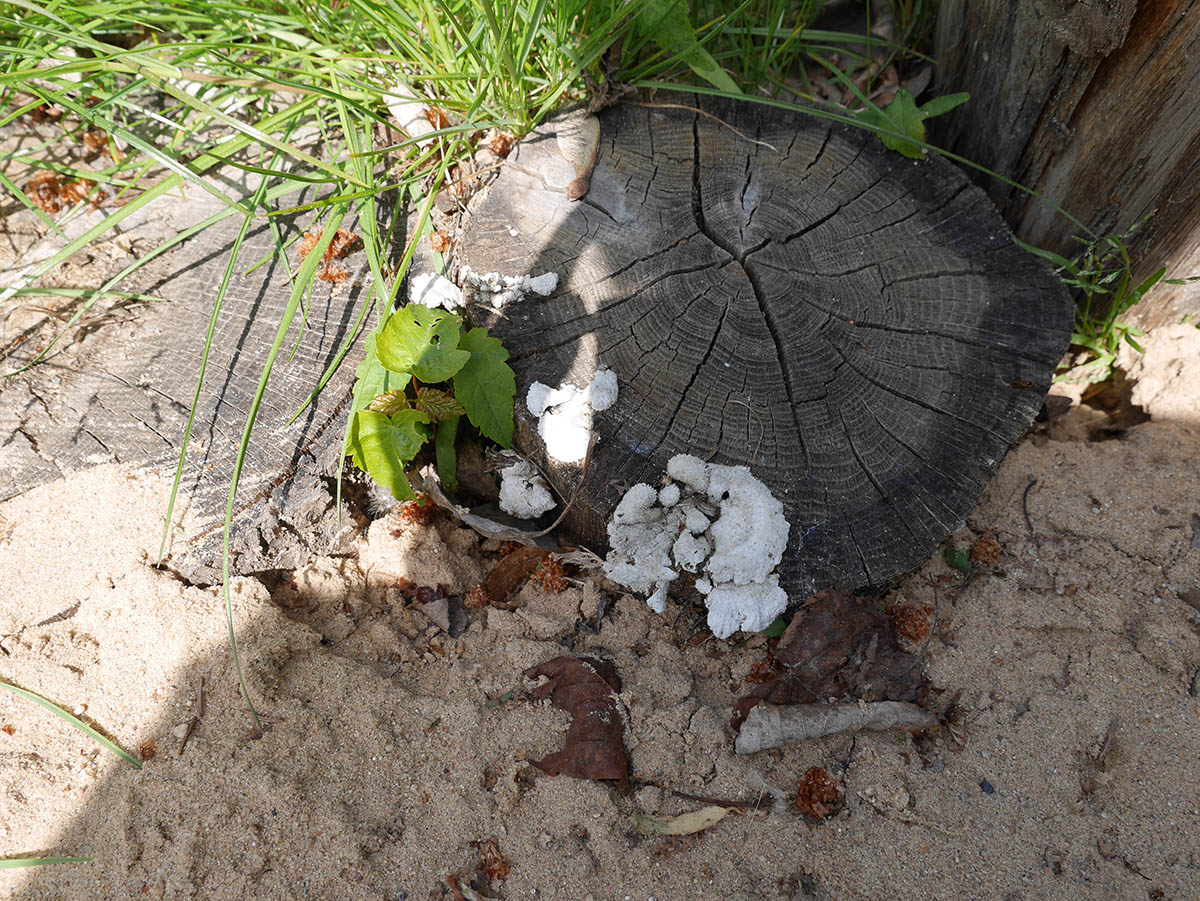 Die Pilze sind weiß und wachsen auf unbehandelten Eichenstämmen, die als Sandkasteneinfassung im Erdreich verbaut wurden. Sie sind ganz dünn und zerbröseln beim Anfassen (zumindest bei unserem trockenem Wetter in den vergangenen Wochen). Die Fruchtkörper lassen sich durch Abkratzen erst mal entfernen.
